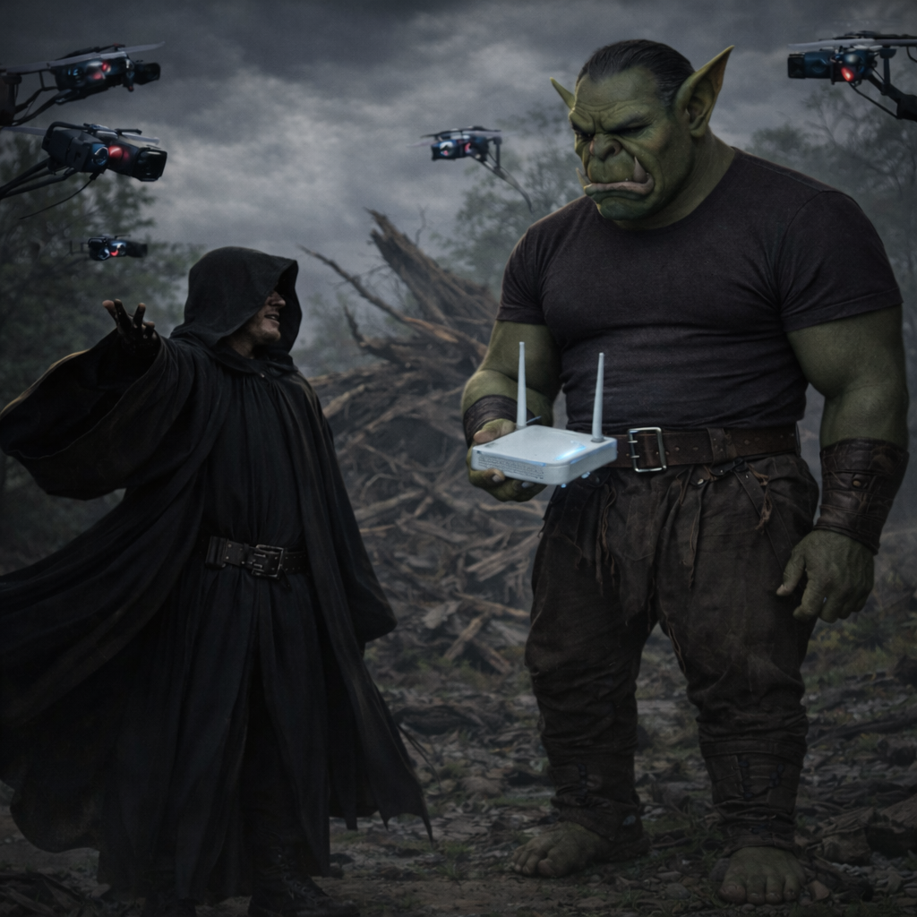 “Excuse me, Sir”, I winced, still unused to the clanking of Jeremy’s voice. Superfluous Man also winced, but he was a more experienced performer and didn’t let any annoyance show on his face in front of the roving cameras. He fixed his smile and turned to face Jeremy. My suspicions about his muscles seemed accurate as there was no sign of any strain whilst lifting the tree. “Good Sir,” he began, “allow me to finish dealing with this malign foe and then I will assist you.” He flashed another gleaming white smile that was entirely lost on Jeremy. The Ogre wasn’t remotely intimidated and pointed at the phone in his other hand, “I just want to know what the Wifi password is.” It took a second for Superfluous Man to process the strange request, and he struggled not to allow his face to bunch into confusion. His eyes darted towards the cameras, probably considering what he could get away with saying whilst maintaining his image of magnanimous nobility. Jeremy continued in his ear-assaulting clank, “I just noticed you had a Wifi router fixed to your belt. I wondered if I could get the password?” With that, Jeremy casually swiped one of his muscled Ogre arms towards the black box he was talking about and crushed it as easily as a biscuit. There was a moment or two, where Superfluous Man didn’t react, and Jeremy stepped away in mock horror, as if he couldn’t believe what he’d done. Several red lights began blinking across the spandex that the Superfulous man was wearing, and the cameras that had previously been positioned with purpose were suddenly disoriented.