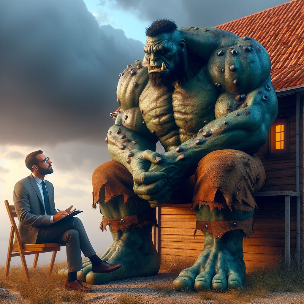 Gorgonzola reread it several times. That sounded like just the thing. A little bit of therapy sounded perfect. He looked around him and noticed a man hiding behind a tree. He grabbed him, being careful not to crush his bones before he could answer some questions. He pointed the man at the billboard. “Where is this man?” He asked, in what he hoped was a conversational tone. The man struggled to speak for a few moments, but Gorgonzola relaxed his grip. The man screamed until he lost his breath, at which point the giant reiterated his question a little more forcefully: “Where can I find this man?” His prisoner was a little shocked that the giant could speak the same language and took a moment to read the address on the billboard. The man extracted an arm from the giant fist enclosing him and used it to point, “It’s two streets away that way.” Gorgonzola decided to use him as a navigator and walked along until the man screeched that they’d arrived. The giant carefully placed the man on the ground, who instantly crumpled onto the floor and frantically started crawling away. Gorgonzola scratched his head for the moment; he always forgot how fragile humans were.